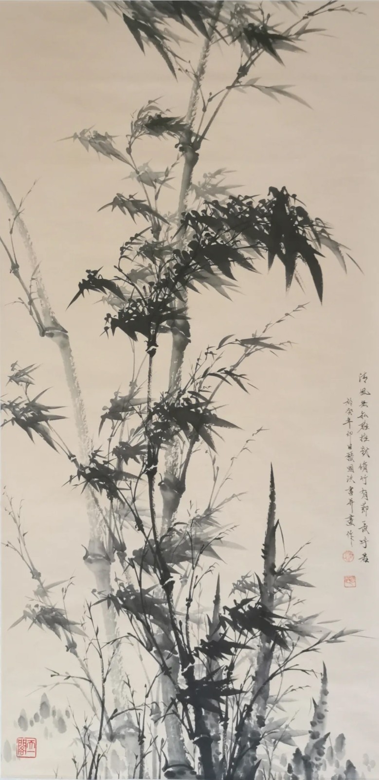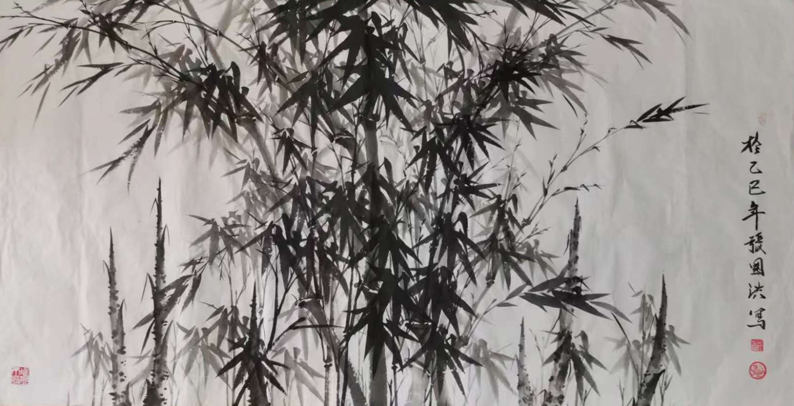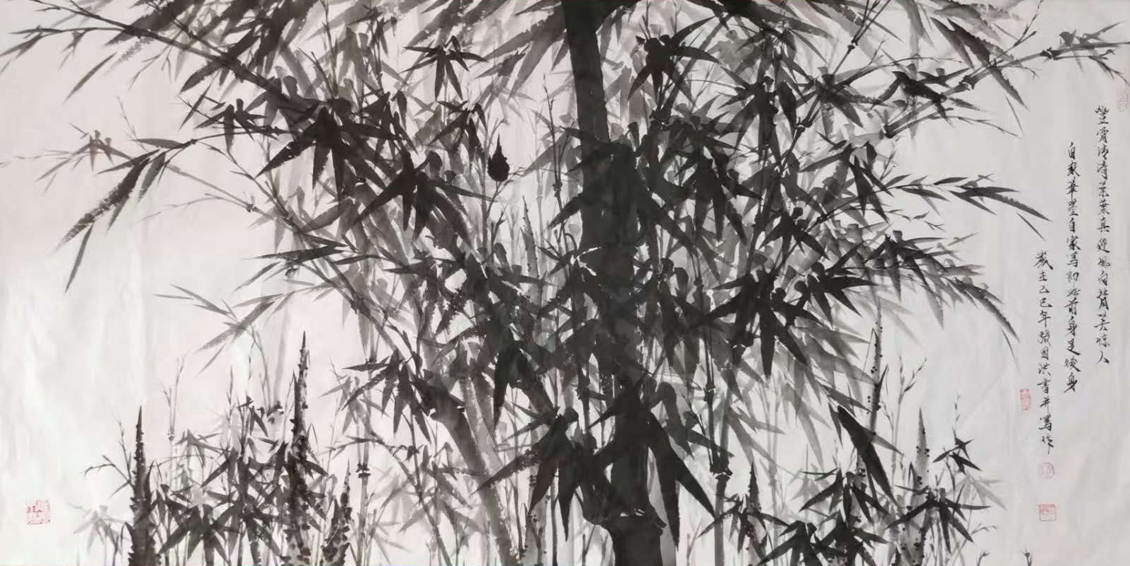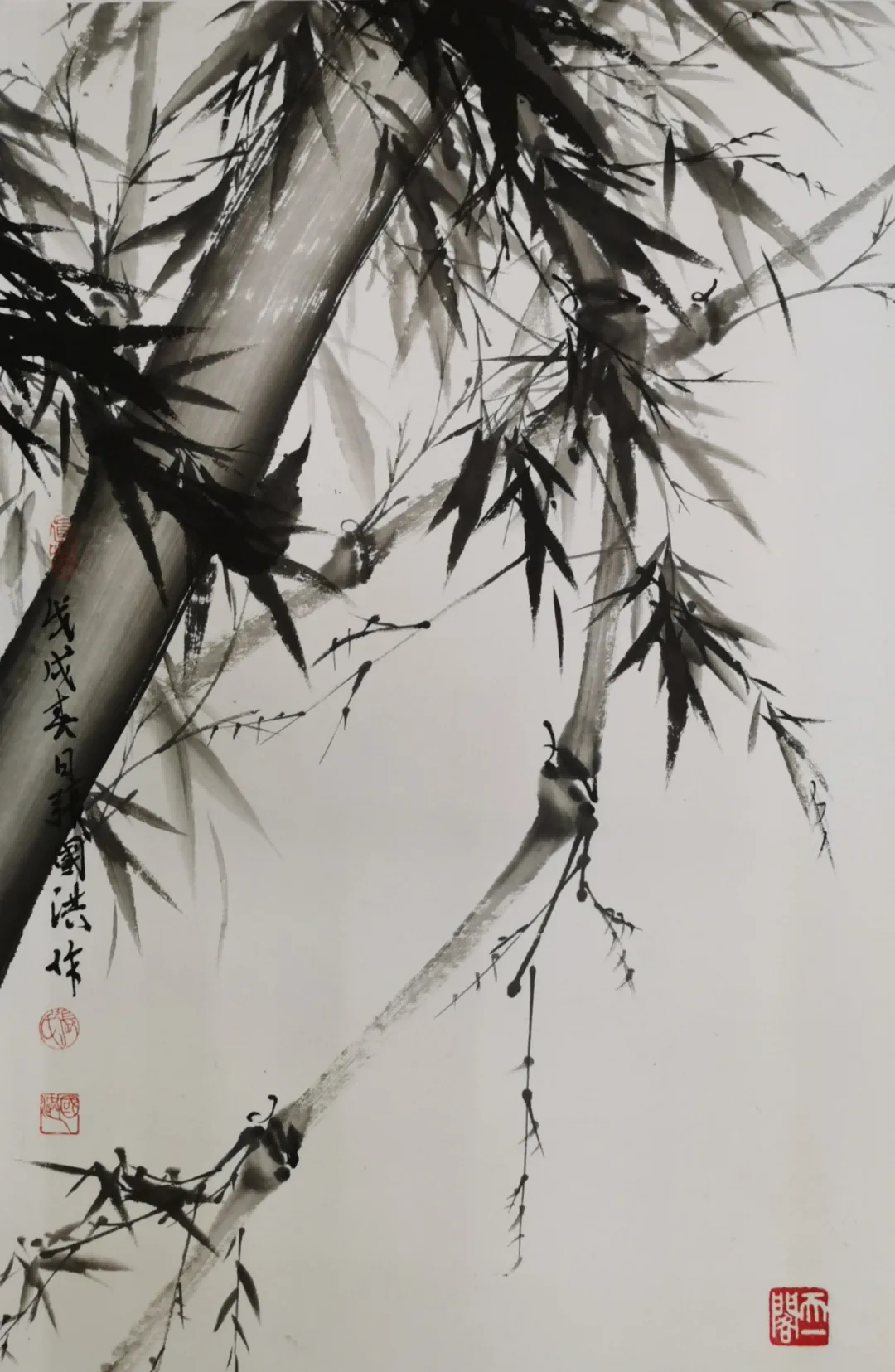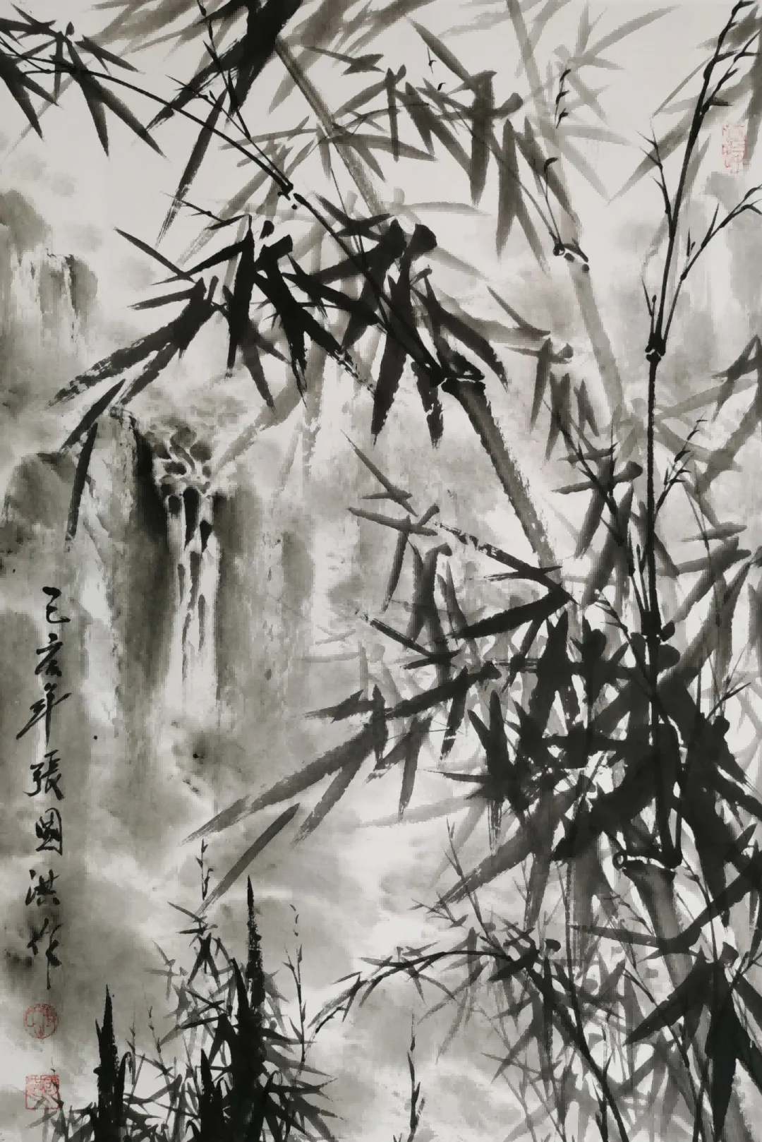 在技法上,张国洪的墨竹体现了对传统的创造性转化。他继承了“以书入画”的理念,将书法用笔的丰富变化运用到竹子的描绘中——竹竿以中锋写出,圆润劲挺;竹节以隶书笔意顿挫而成,凝重有力;竹叶则以草书笔法挥洒,飘逸灵动。但与传统墨竹不同的是,张国洪更加注重整体氛围的营造。