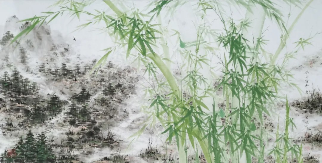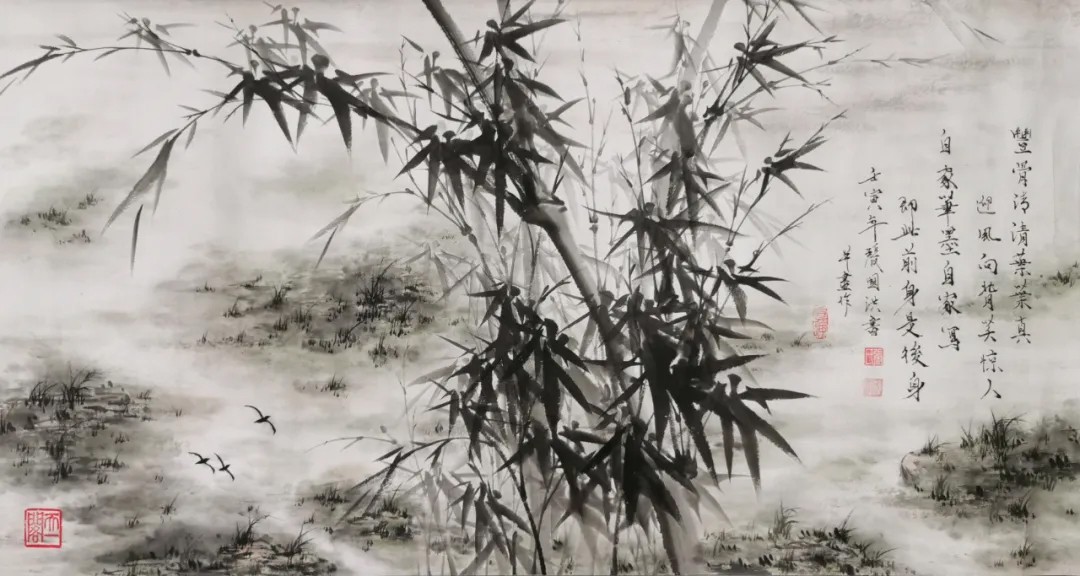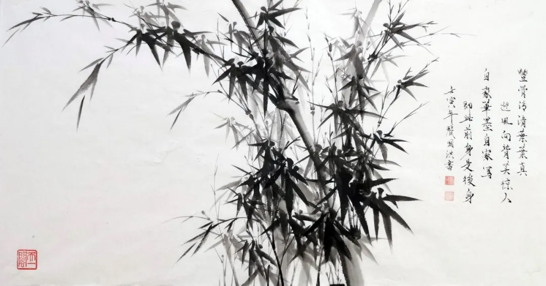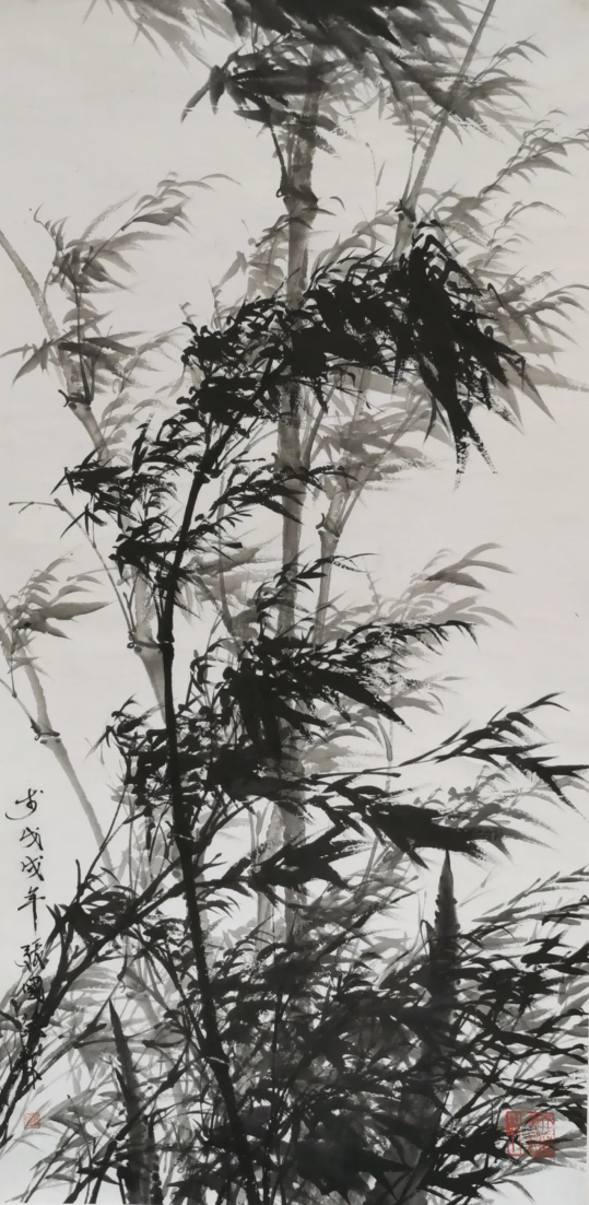 张国洪的墨竹,最为人称道的是其对“竹魂”的深刻把握。他笔下的竹子,不仅仅是自然物的再现,更是人格精神的物化。在《风摇青玉枝》中,他以浓淡相间的墨色,表现出竹子在风中摇曳的动态美感。竹竿挺拔有力,竹叶纷披有致,疾风劲竹,不折其节,正是中国文人“富贵不能淫,贫贱不能移,威武不能屈”的人格写照。