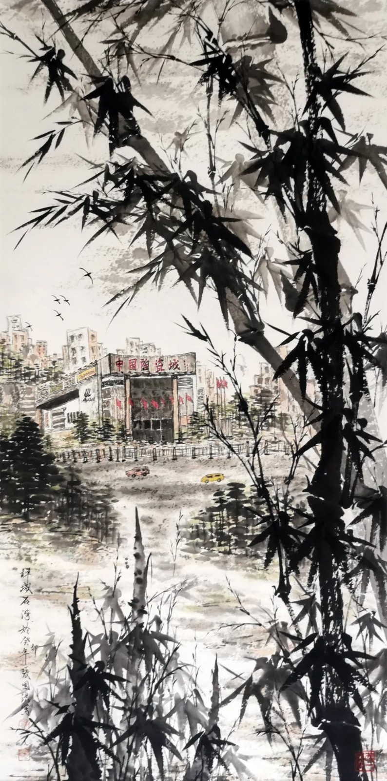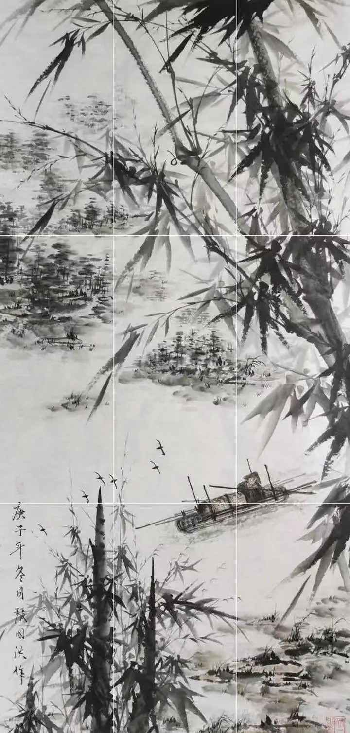张国洪的艺术探索,不限于传统的纸本水墨,而是呈现出多维度的创新特征。2024年7月,他参与“釉上星彩”地面瓷绘集群展示项目,作品《墨竹-编号0802》以“釉上彩”形式烧制成瓷片并镶嵌于国家游泳中心(水立方)地面。这一创作具有多重创新意义:从墙面展示转为地面呈现,改变了观者与作品的互动方式;它实现了水墨艺术与陶瓷工艺的跨媒介融合,墨竹的笔情墨趣通过釉彩的烧制转化为永恒的物质存在;这种公共空间的艺术形式,打破了传统国画的精英化欣赏模式,使其成为可触可感的日常审美体验。