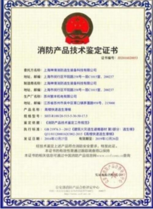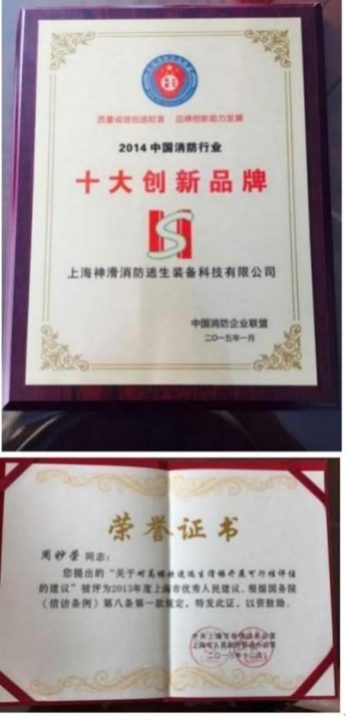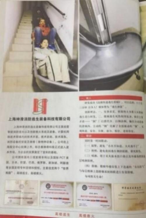 8) 人民日报主办的《新安全东方消防》载文《神奇滑梯诞生记》 指出: "《高楼快速逃生滑梯》”为高层建筑逃生带来了新的曙光如果能投入生产将对我国建筑设计和消防法规修改产生很大的影响。
